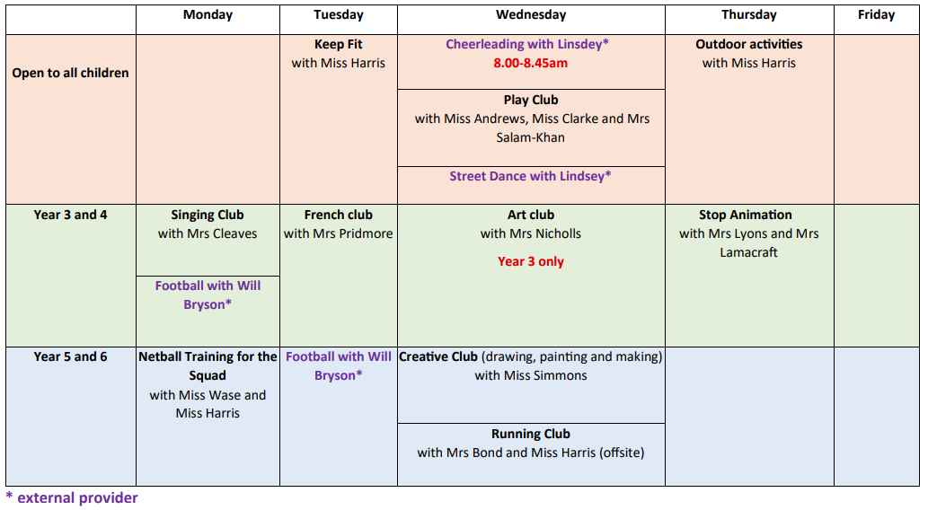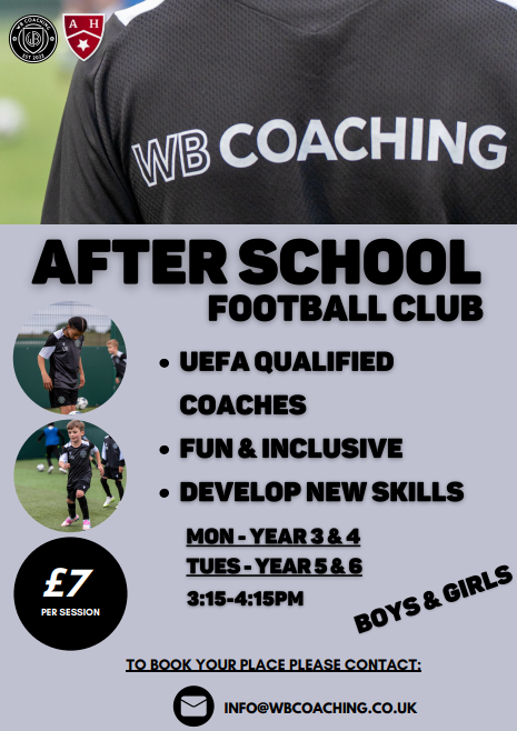 Football is run by Will and his team. Year 3 and 4 is on Mondays and Year 5 and 6 is on Tuesdays after school. Sessions are £7 each. Please use the following link to book: https://coaching-wb.classforkids.io/term/3