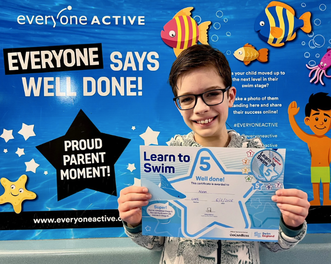 Congratulations to Adam in Year 6 for passing his Swim England Stage 5 level and moving onto Stage 6 dark blue hat group. Well done, Adam!
