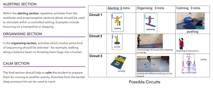 At Almond Hill children whose sensory needs have been identified, typically have two sessions a day each lasting approximately 10 minutes in the Cedar room. Here they can use the circuit to help regulate these 3 senses -touch – vestibular – proprioception.