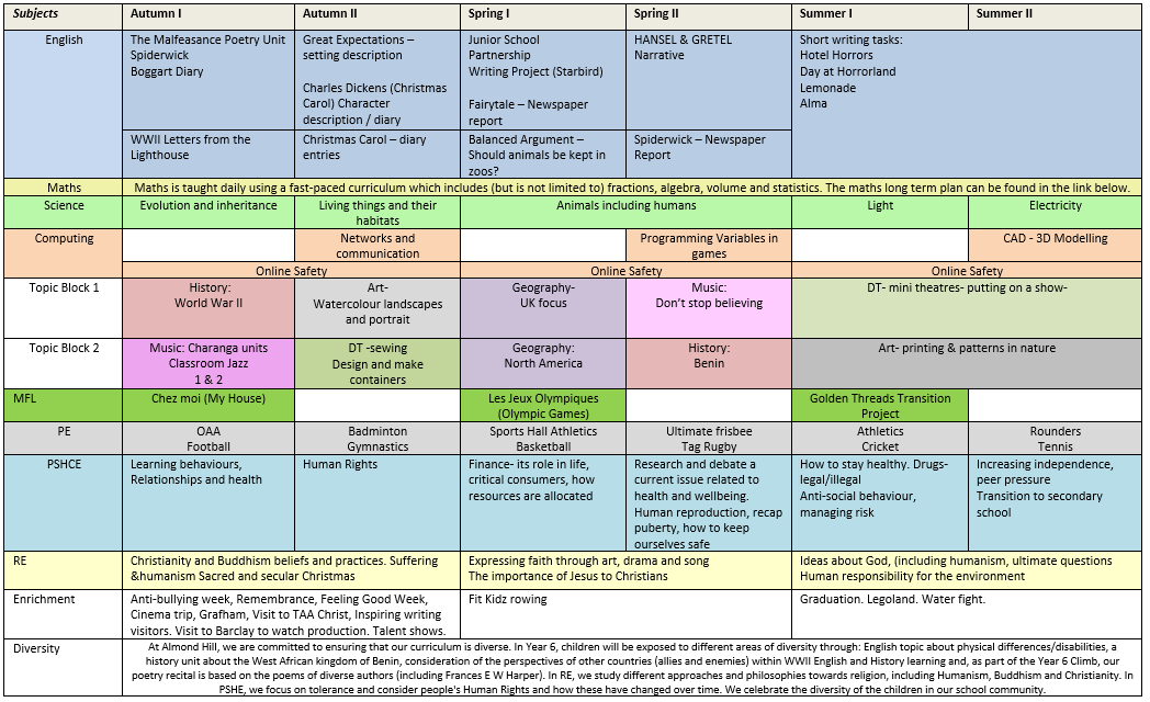Some subjects are taught weekly: Science, PE, French, RE, Computing and PSHCE. Some subjects are taught in ‘blocks’: Art, DT, History, Geography and Music.