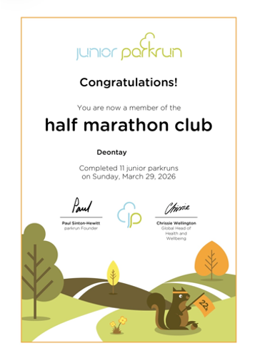 Well done to Deontay in Year 3 who is part of the 'Half Marathon Club' after completing 11 junior park runs! Congratulations.