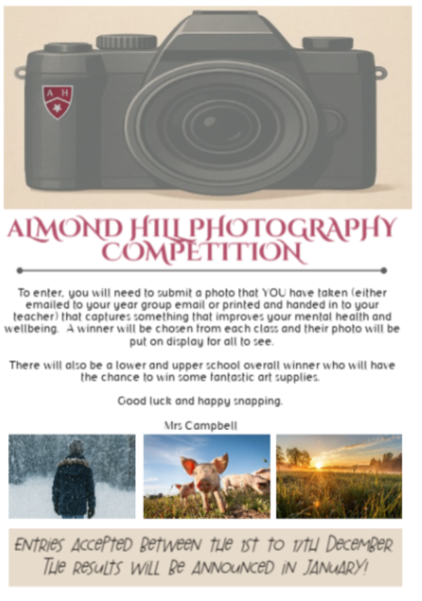 We end the final week with another Almond Hill tradition – our talent shows will take place during the school day on Thursday 18th December. Teachers will be running auditions for children who want to take part and they will be informed by their class teacher if they have been successful. They may bring special props or chosen outfits for their performance. Children in the upper school will perform in the morning and the lower school in the afternoon.