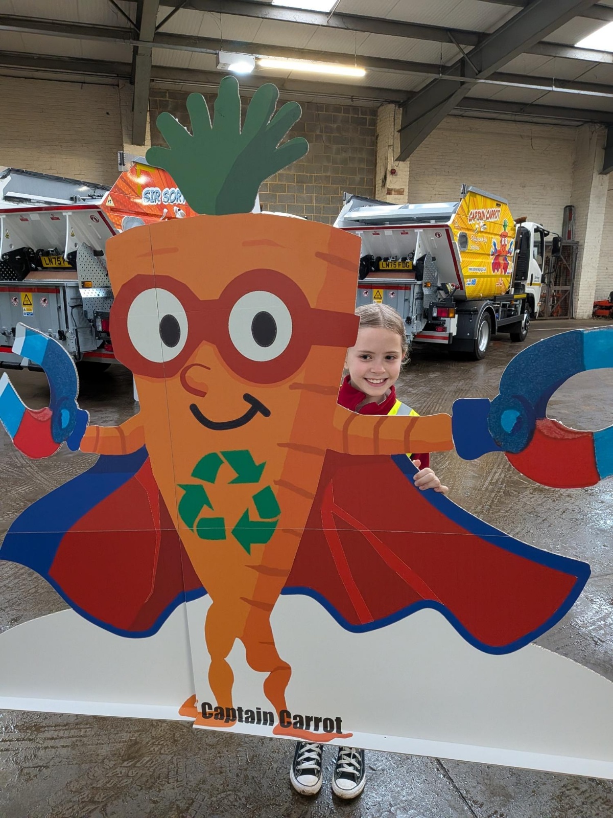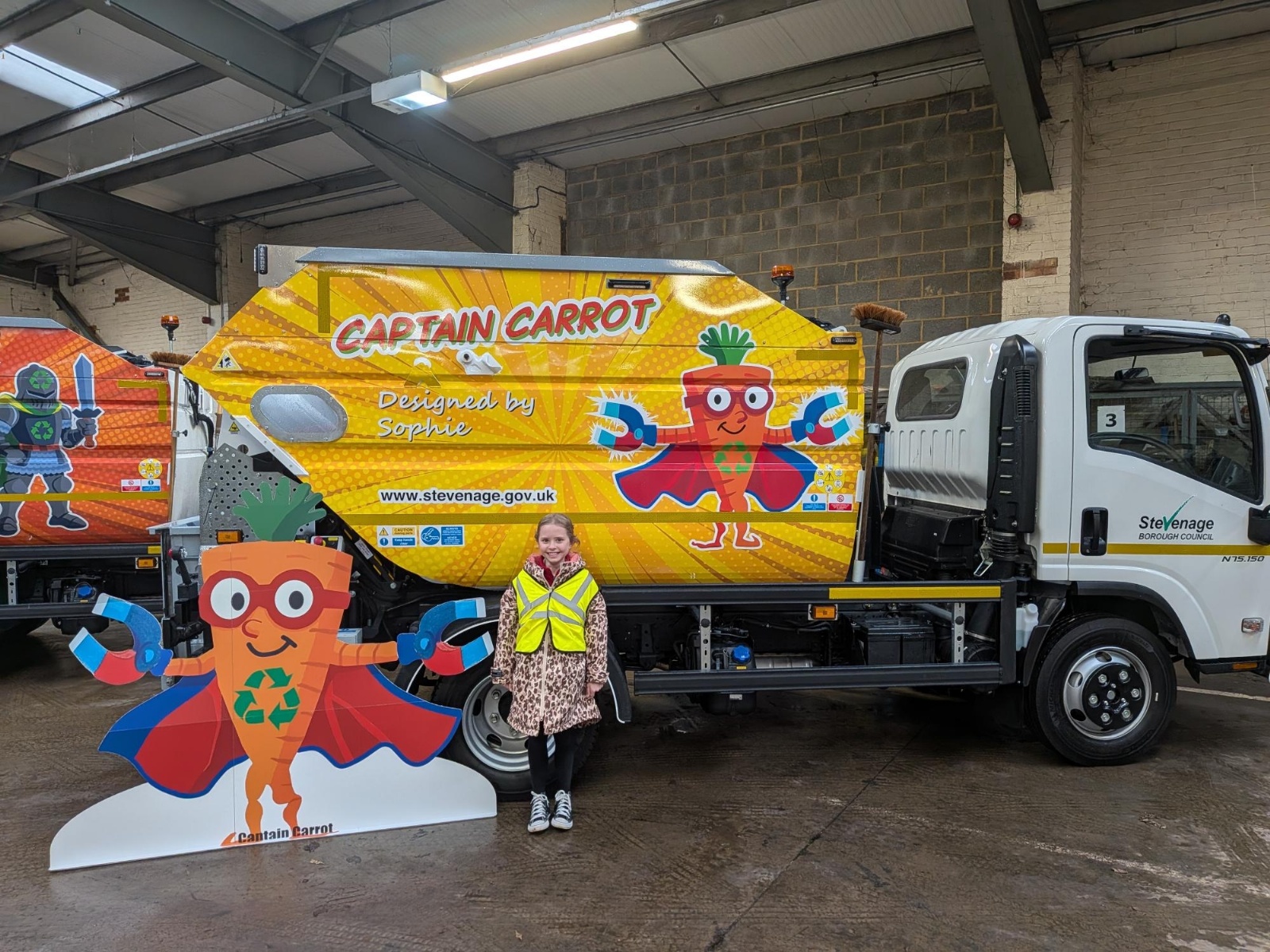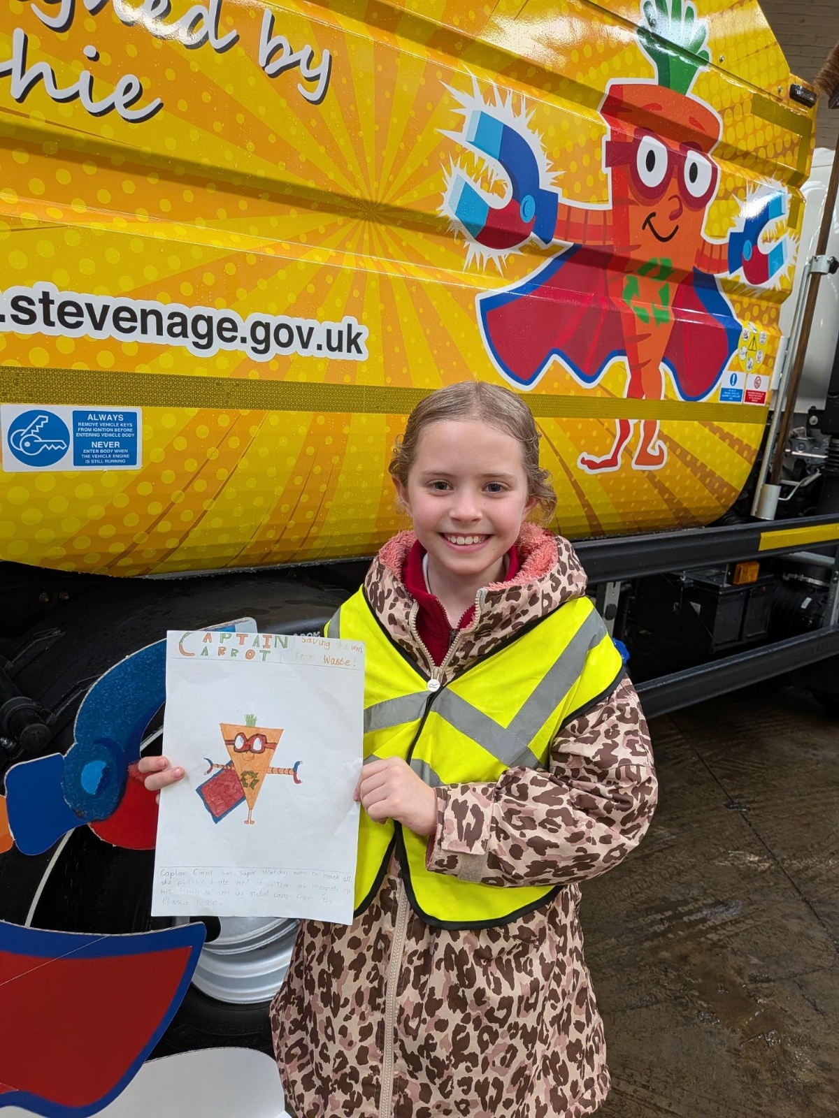 When I was in year 4, the school entered a competition. We had to design a recycling hero. Last term, I found out that I had won in my age category. So last week, I went to the Stevenage Borough Council waste depot to see my character on the waste truck. I got to meet the other winners, the mayor and a councillor. We had a look around the recycling centre and then went to a large warehouse where I saw my truck with my character, Captain Carrot, on it. I had lots of photographs and did a video with the councillor. After this, I got presented with a certificate and got to take home a life-size cut out of my recycling hero! From the 2nd March, my truck will be used to collect waste all over Stevenage!